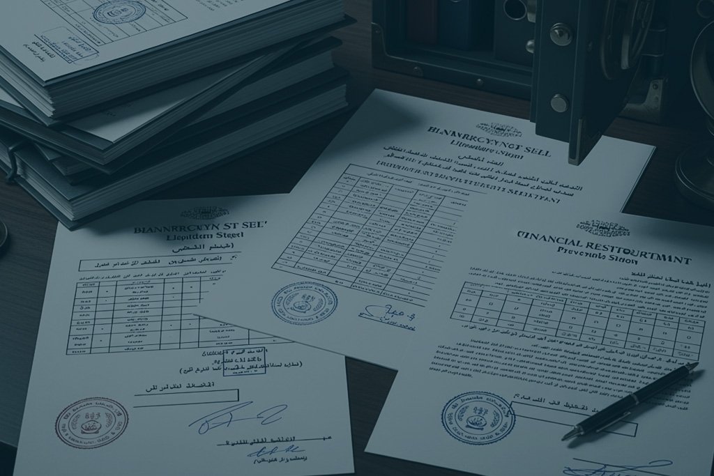 بيانات مالية أساسية، قائمة الديون والدائنين، العقود والالتزامات، وأي مستندات تُظهر أسباب التعثّر ونطاقه.
